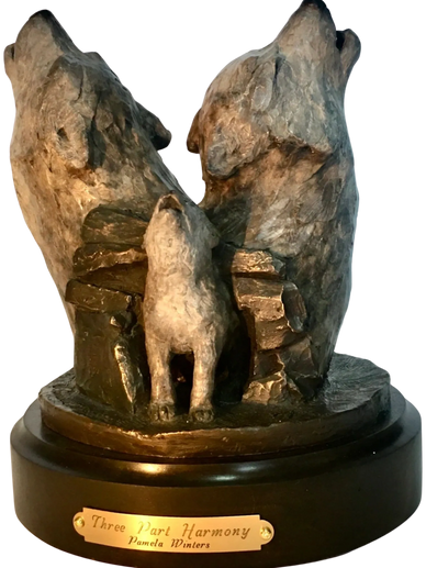 A pair of wolves are howling. A cub comes out of the den and joins in for a Three-Part Harmony!