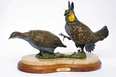 Female and male prairie chickens. The male's bright orange throat sac is puffed and his crest is up as he pursues the female. Mating season lasts from early March through early May.
